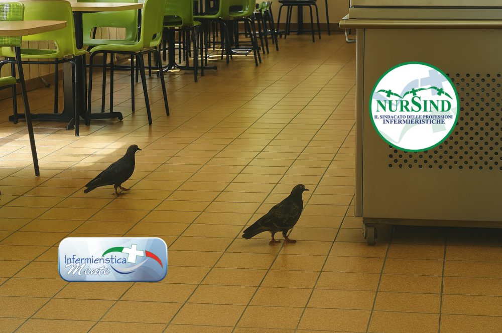“Sulla base di informative e indicazioni fornite da numerosi lavoratori – si legge nella nota firmata da Andrea Zambelli, segretario territoriale, e Nicola Palmieri, segretario amministrativo del NurSind – segnaliamo la presenza costante di volatili che liberamente passeggiano presso l’area dedicata al refettorio aziendale durante gli orari di distribuzione e consumo dei pasti. Gli stessi, oltre a sostare sui tavoli e sulle sedie, lasciano escrementi compromettendo la salubrità degli ambienti”.