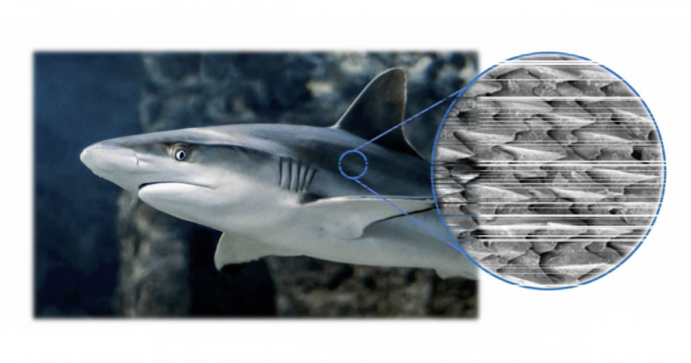 Nel 2002, Anthony Brennan, ingegnere dei materiali all'Università della Florida, stava lavorando su commissione dell'ufficio ricerca della Marina americana su come impedire ad alghe e organismi marini di incrostarsi sugli scafi dei sottomarini. Cercando quale animale marino di grandi dimensioni non soffrisse di questo problema — il cosiddetto biofouling — trovò la risposta nei libri di biologia marina: lo squalo era il solo animale marino a lento movimento che non si incrostava mai. Scoprì che la superficie della sua pelle non era liscia ma ricoperta di minuscole scaglie con creste parallele, i denticoli dermali, alte circa 3 micrometri. Nessuna sostanza chimica, nessuna secrezione: era la geometria stessa a impedire ai batteri di attaccarsi, perturbando il sottile strato di fluido a contatto con la pelle e privando i microrganismi della zona di flusso lento in cui normalmente si ancorano.