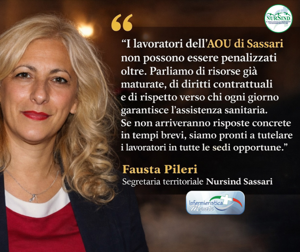 Sassari, 2 marzo 2026 – “La questione dei fondi dell’AOU di Sassari non può più trascinarsi oltre”: con queste parole Fausta Pileri, Segretaria territoriale di Nursind Sassari e componente della Direzione Nazionale Nursind, commenta l’esito dell’incontro svoltosi in Regione e dedicato alla problematica della certificazione dei fondi contrattuali.