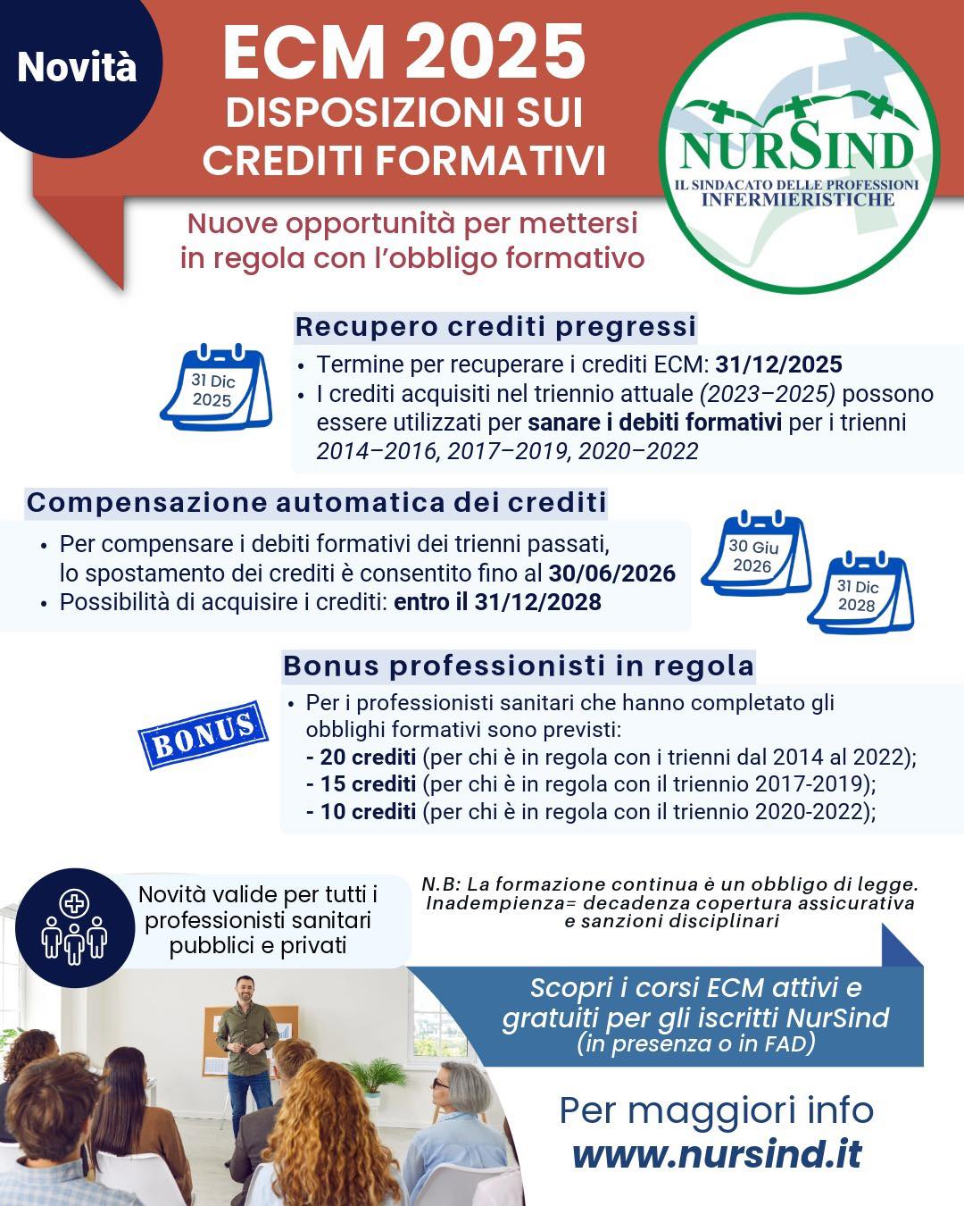 30 ottobre 2025 – Il 2025 segna un punto di svolta per i professionisti sanitari in tema di crediti ECM (Educazione Continua in Medicina). Il sindacato NurSind lancia un'informativa chiara ed essenziale sulle nuove disposizioni per i crediti formativi, offrendo a tutti gli operatori — pubblici e privati — nuove opportunità per regolarizzare la propria posizione.