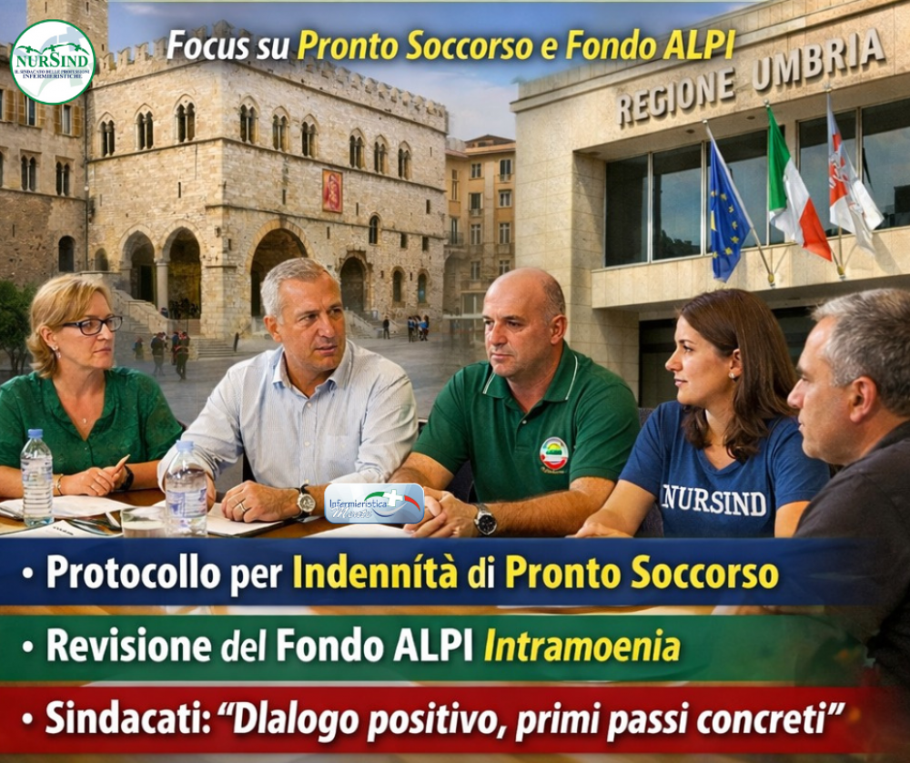 Si è svolto, nella sede del Palazzo Broletto, il primo incontro regionale tra le organizzazioni sindacali della sanità e la Regione Umbria per dare attuazione al CCNL Sanità 2022-2024. Al tavolo erano presenti CISL FP Umbria, FIALS Umbria, NURSIND Umbria e NURSING UP Umbria.Il confronto, definito da entrambe le parti improntato a un clima costruttivo e trasparente, ha segnato l’avvio di un percorso condiviso su alcune delle principali questioni che riguardano il personale sanitario regionale. Un primo passo che punta a tradurre le previsioni del contratto nazionale in misure concrete a livello territoriale.