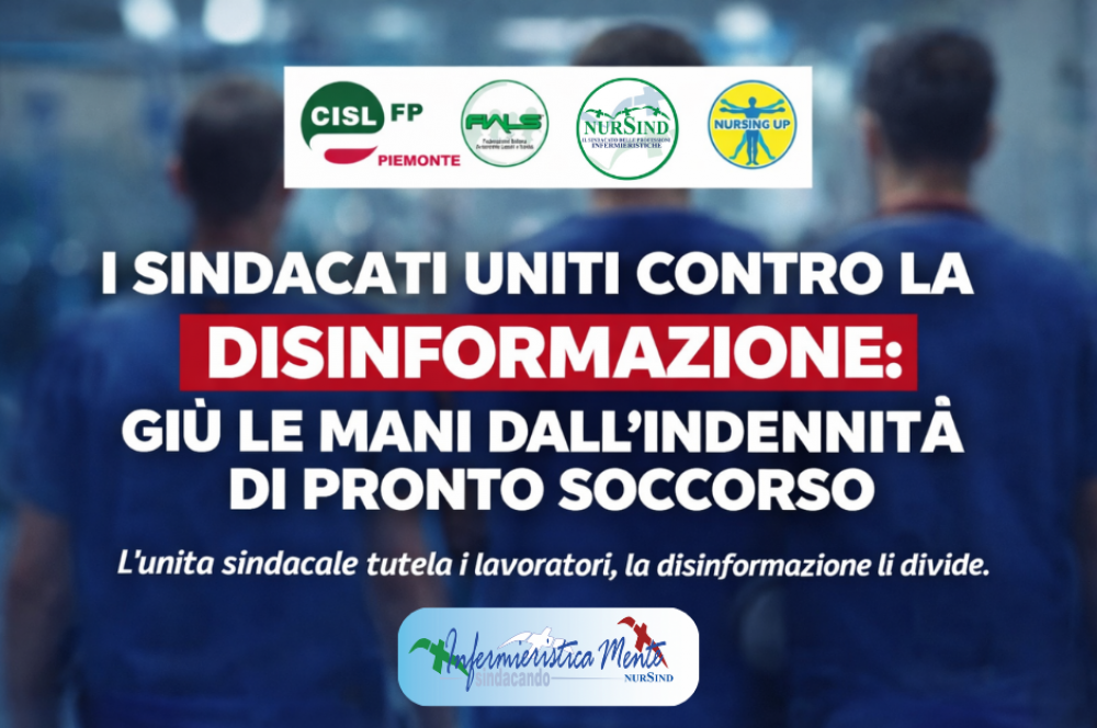 Torino, 22/01/2026. Nel clima di tensione che ha accompagnato il dibattito sull’indennità di Pronto Soccorso in Piemonte, le organizzazioni sindacali NurSind, CISL FP, FIALS e Nursing Up intervengono con una presa di posizione unitaria per ristabilire verità e correttezza informativa. Una risposta netta a quella che viene definita una narrazione fuorviante, costruita più sulla contrapposizione che sui contenuti, e che rischia di colpire direttamente chi ogni giorno opera nei servizi di emergenza.
