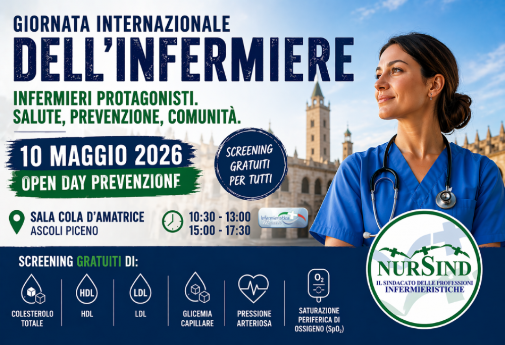 Ascoli Piceno, 21/04/2026. In occasione della Giornata Internazionale dell’Infermiere, il NurSind di Ascoli Piceno sceglie di anticipare le celebrazioni e lo fa con un segnale chiaro: mettere la prevenzione al centro e riportare l’infermiere al cuore del territorio. L’appuntamento è fissato per il 10 maggio 2026, con un Open Day aperto alla cittadinanza che trasforma la ricorrenza in un momento reale di assistenza e consapevolezza sanitaria.